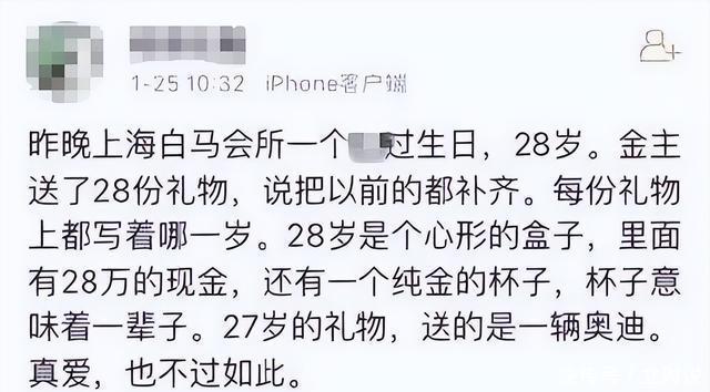 送豪车、给现金是常事,甚至在男模生日时,一次性补齐 28份生日礼物, 补齐之前所有生日的心意。 谁能想到,这堆价值几百万的东西,竟然是 已婚富婆 给 28岁男模 的生日大礼, 一条朋友圈 直接把秘密捅破了。